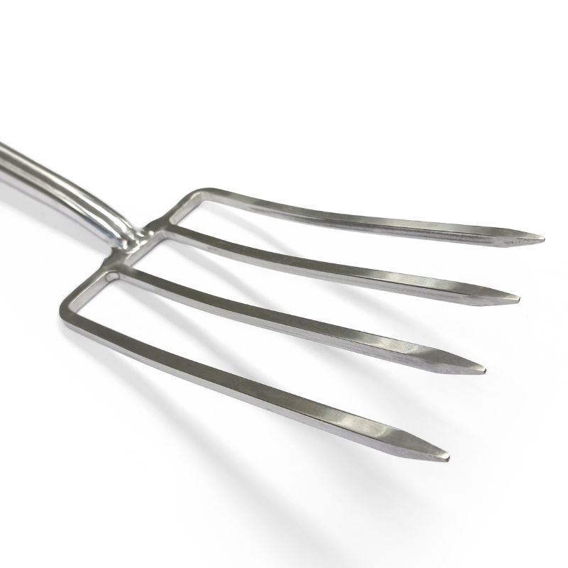 The fork's tines, crafted from mirror-polished stainless steel, slice through compacted earth effortlessly and resist sticking, making digging and aerating smoother and faster. The stainless steel head is firmly riveted into an extra-long lipped socket, adding robustness and structural integrity where most tools weaken over time.